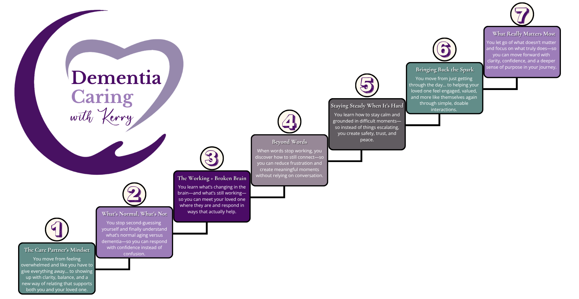 Dementia Caring with Kerry is a self-paced, 7-lesson experience designed to help you move from uncertainty and frustration, to clarity, confidence, and meaningful connection.